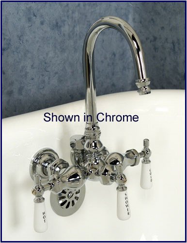 New Clawfoot Tub Diverter Faucet with Gooseneck spout and porcelain handles. Satin Nickel finish and brass construction. It is in a antique Victorian style from Barclay. This faucet has 3 Porcelain Lever Handles that say "hot", "cold", and "shower". 3 3/8" Center Faucet. Compression Stems - 1/4 turn. 3.68 GPM @ 80PSI. Just add a riser for a shower or cradle with a hand held shower (not included). Takes a 3/8" riser, uses a compression fit. Please contact us if you have any questions or need help finding the correct faucet for your tub. More clawfoot tub items in our storefront.
